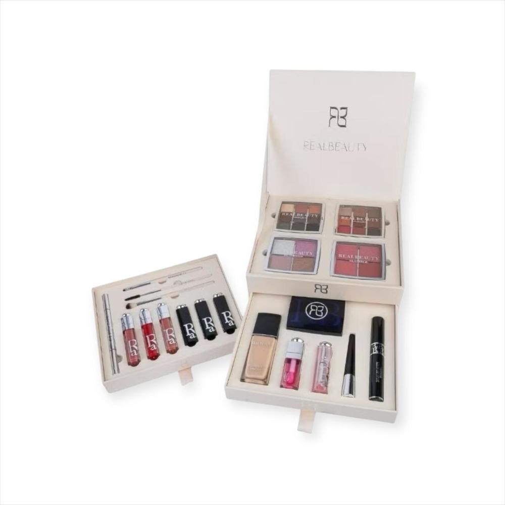 مجموعة مكياج مثالية هدية للعروس وللحفلات مكياج بنات متكامل في علبة فاخرة مكونة من ارواج جافة وارواج سائلة وكريم اساس وبودرة وجه وظل وبلاشر اضاءة وجه ومسكرة وايلاينر ومرطب شفاه كلها في صندوق واحد